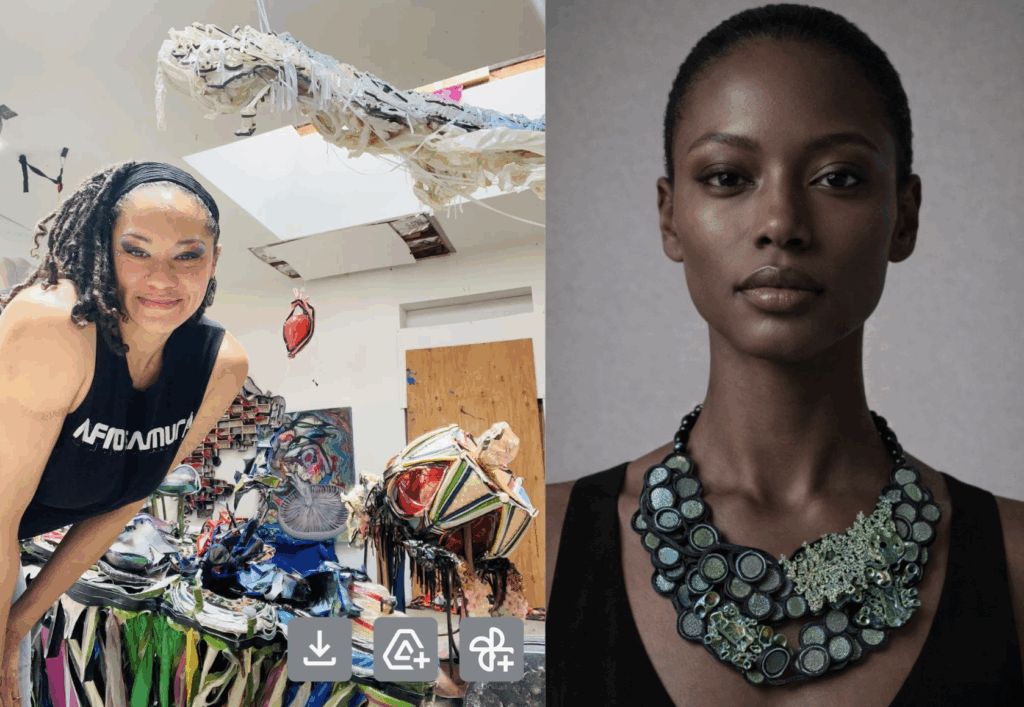 Alicia Piller is an LA-based mixed media artist and jewelry maker, turning trash into treasure. She transforms recycled textiles, found objects, and industrial scraps into sculptural, wearable art that’s as sustainable as it is striking. Rooted in Afro-futurist storytelling, her pieces weave ancestry, history, and cosmic vibes into every design. You can snag her jewelry on Etsy—or spot it in museums like L.A.’s Craft Contemporary and the Houston Center for Contemporary Craft.